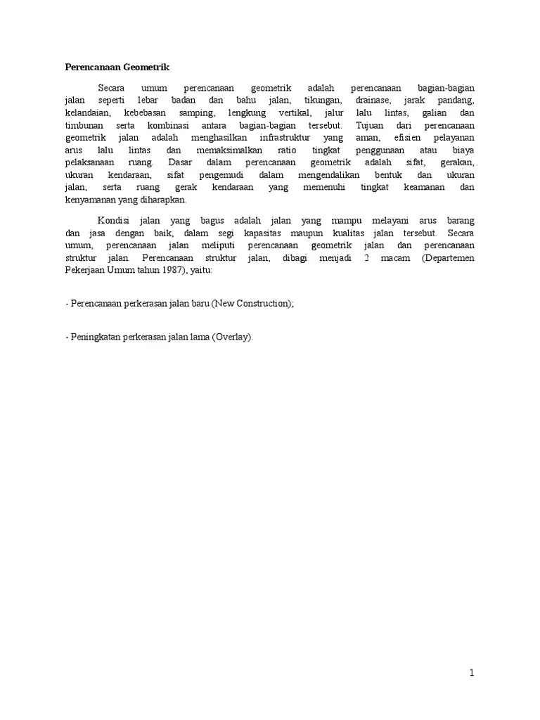 Hasil dari perencanaan geometrik jalan dengan panjang 4,617 km, klasifikasi medan yang ada pada jalan rencana merupakan daerah datar, kecepatan rencana 60 km/ . Permasalahan dalam perencanaan geometrik jalan raya yang dititik beratkan pada perencanaan suatu jalan. (ls) menurut tata cara perencanaan geometrik jalan antar kota 1997 adalah . Definisi dan kriteria perencanaan geometrik jalan rel alinemen jalan rel. Pi bm 0 sta 0+000 x=10.000 y=10.000 z=1000 .
